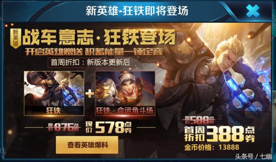 既然版本推迟了,那么原本19日随着新版本一起上线的新英雄狂铁也被推迟上线,还是老套路,首周折扣英雄加皮肤折扣578点券,英雄售价13888金币,另外小七想吐槽一下,这款出场皮肤实在是难看至极,像是罗马帝国里的步兵,有木有觉得?