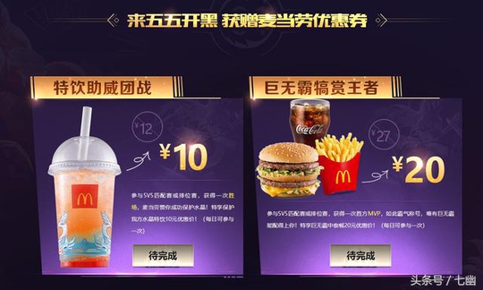巨无霸合作的活动是在五五开黑节进行的,而参与方式就是5v5的匹配或排位赛赢得一局比赛,获得一次MVP,即可享受麦当劳巨无霸的优惠,优惠有两个,都是折扣优惠券,一个是优惠了2块钱,一个是优惠了7块钱。