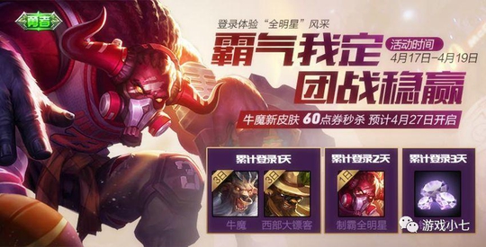 活动当然是以牛魔为中心展开的,所以这次天美给的小福利就是60点卷秒杀牛魔五五开黑节的新皮肤“制霸全明星”,天美预计在4月27日开启,目前王者荣耀和麦当劳这个合作活动已经开始了,本次活动时间为2018年4月18日-2018年5月15日。