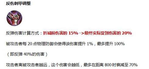 反甲的削弱力度较大,增加了距离削减机制,因此反甲在面对射手时收益大大减低。但在战士、坦克之间肉搏的时候还是必出的装备。