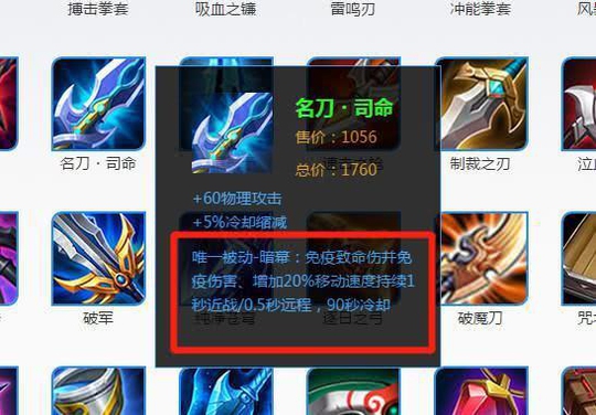 NO2、名刀·司命:名刀在王者荣耀中的名声可大了。然而名声大貌似并没有什么用,照样出它的玩家并不多。高端局中还可能会出现几次,低端青铜局,怕是看完它的那些永久加成和价格就直接放弃了吧?名刀的唯一被动-暗幕:免疫致命伤并免疫伤害,同时还增加英雄20%的移速。后面的忽略不说,就这个免疫致命伤,就这个效果,直接等同于一个短暂的无敌啊!有这个在,那个刺客还能一套秒了你了?