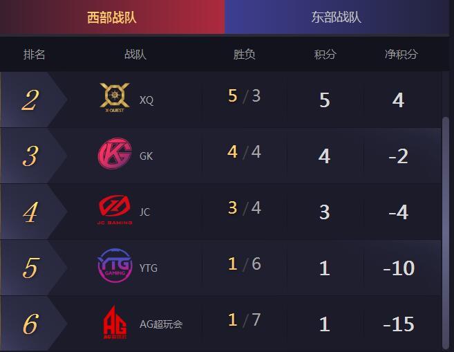我们主要来看看西部赛区吧,YTG凭借这场胜利让排名成功的上升了一位,已经超过了AG超玩会,大家可以看到虽然YTG和了AG超玩会都只是胜利了一场,但是他们的净积分差别却很大。这也说明了YTG基本上每场比赛都是敢打敢拼,和敌人打得比较焦灼。而了AG超玩会好多都是0比3败北,这对排名还是有一些影响的。