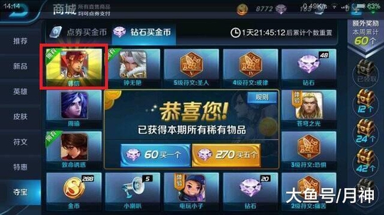 这张两年前的商城夺宝截图我想很少有玩家见过吧!当时还没有王者水晶,想要获得韩信只要用钻石抽取就行,而且但是命中率还是非常高的!