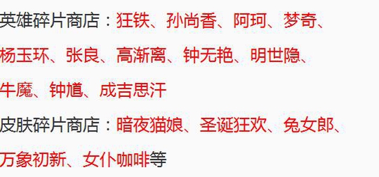 英雄碎片商:其中狂铁、牛魔、高渐离、钟馗值得兑换,其他英雄可有可无。牛魔将在4月27日会推出6元福利皮肤,没有牛魔的玩家记得兑换,没有牛魔则不可以购买6元限定皮肤。