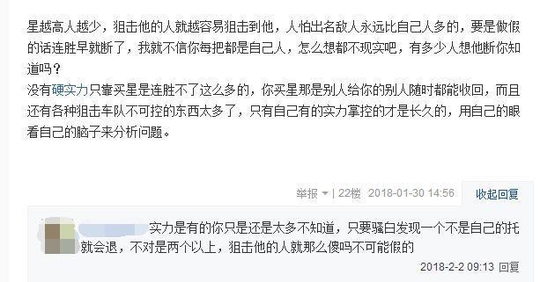 而后又有网友说道有实力为什么不单排,要三排,而且carry的是另外两个三排队友,可见是在抱大腿,而在单排的时候又经常被对面打崩,是请演员的主播。
