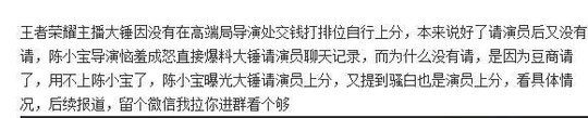 后面有人更是发出前几天王者荣耀另一主播与演员导演闹翻了,被导演爆了出来一直买演员的事情,牵扯到了骚白,因为导演在推销的时候说漏嘴,说出了骚白也是一直找演员上分连胜的。