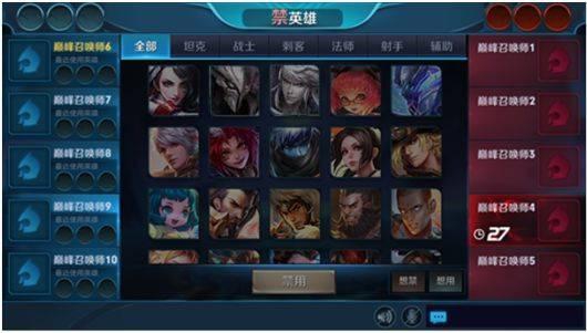 2、为了使比赛更具竞技性,巅峰赛中每方玩家能够禁3名英雄,由双方的3,4,5楼玩家交替禁用