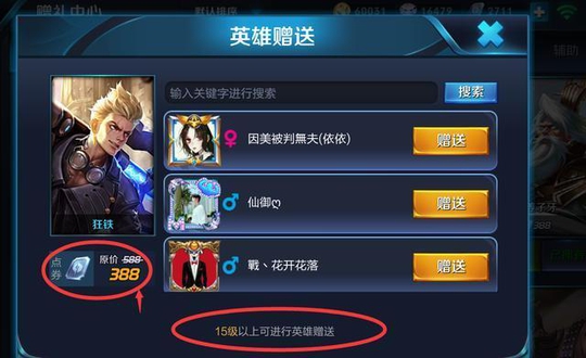 点击赠送就可以看到如下图所示,这个送英雄的系统需要15级以上且只能点券赠送。