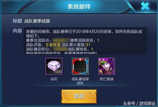 另外战队赛季结算奖励是通过邮件自动发放给玩家,上个赛季排名前一百的战队将获得高渐离死亡摇滚皮肤和钻石奖励,已拥有皮肤的话将自动转化为10个皮肤碎片,当然前三战队还能获得专属动态头像框!