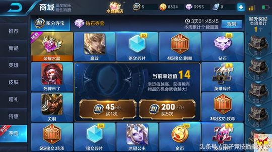 当然,这次的更新也顺带对夺宝方面进行了更改。目前奖池内拥有嬴政、关羽、死神来了和冰冠公主,而王昭君的偶像歌手并没有登场,不知道是不是官方忘记改了。另外值得一提的是,积分夺宝折扣活动又开启,但那次夺宝45点券,5次夺宝200点券。钻石奖池内,太乙真人、芈月和廉颇登场了。而新赛季的开始,虽然大家又能得到一笔钻石了,但是王者商店内依旧是韩信、教廷特使以及海滩丽影这3件商品,所以即使抽到了王者水晶也无法兑换。