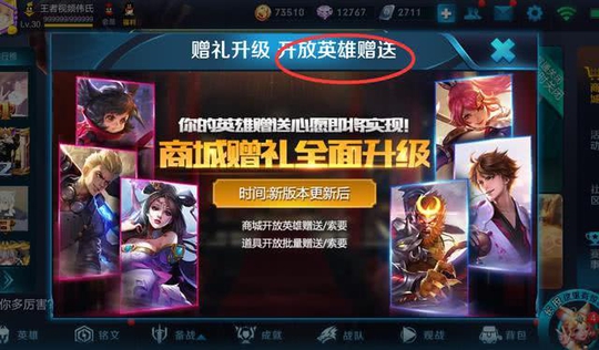 新版本第五件大事开放英雄赠送系统,以后商城不止可以送皮肤还可以送英雄了。好事?额,仔细想了一下,是不是送完英雄就会出皮肤,这是敛钱的套路升级了呀!