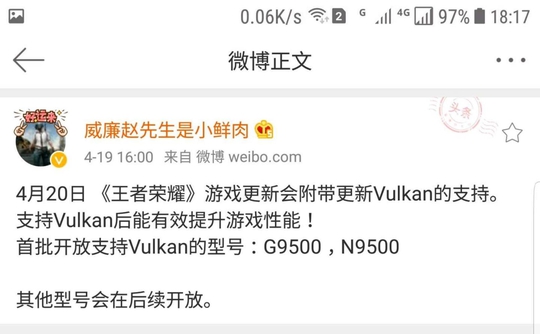 根据微博用户@威廉赵先生是小鲜肉 的爆料,新版《王者荣耀》加入Vulkan图形接口确有其事,只不过目前只有三星G9500、N9500两款手机支持。我们知道,G9500其实就是国行版三星Galaxy S8,而N9500则是Note 8,也就是市面上只有这两款三星手机支持《王者荣耀》的这一新特性。