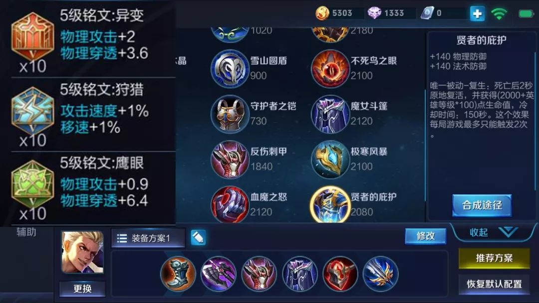 经过笔者对狂铁的大量探索,发现这个英雄出半肉装竟然是最合适的,并且前期出个攻速鞋和其他战士单挑的话,是非常强势的,毕竟其一技能是可以回复生命值的,续航能力很不错!而在中期出场反甲以及魔女,都能增强自己的是生存,而在后期就可以补上碎星锤同破军,提高对敌人的伤害!铭文则推荐异变+狩猎+鹰眼!