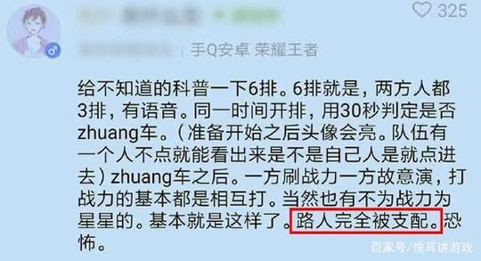演员中除了那些刷国服称号的,还有一种为“6排”上分队。可能大家听到“6排”这个词有点懵逼,官方最高才5排,何来的6排?其实是在高段位的时候,那些冲分的人会找6个人进行排位,分别是3个人组队3排,而2队在同一时间开始匹配,然后在通过语音沟通,一起先别进,看是否是自己人(如图所示),这样就能知道2个队伍是否有排在一起(高分段上分玩家不多,撞车的几率非常高),这样就可以进行人为操控上分了。