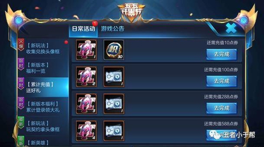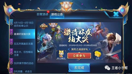 另外玩家邀请好友登录游戏即可参与抽取契约之战多种套路组合体验卡和QB等奖励,比如百里守约和干将莫邪、程咬金和鲁班七号等,该活动基本是必得英雄体验卡,建议小伙伴们可前往活动面板中的游戏公告参与哦!
