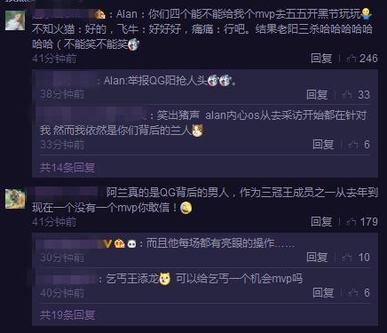 赛后很多QGhappy的粉丝还开起了玩笑。因为这次五五开黑节需要参赛队员有一个MVP,但是ALAN却连一个MVP都没有,而今天他又没得到MVP,于是很多玩家都来调侃他,想起来确实是有点悲剧啊,毕竟他周围的队友都太强了。