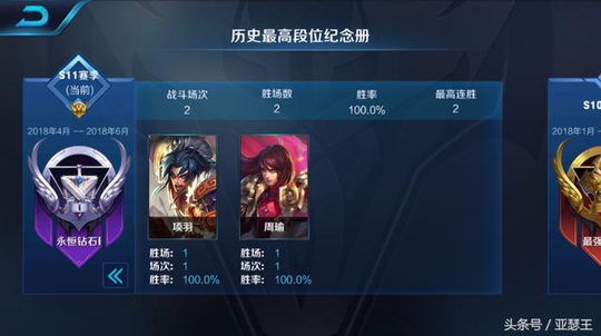 2、具体英雄,一局辅助项羽,一局中路法师周瑜,这两个英雄在新赛季依然很给力,喜欢的可以尽量玩。