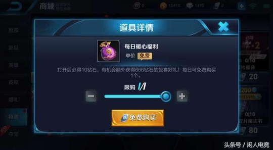 最后一个也是简单的获取方法,天美白送的福利,在特惠-每日限购里面。这个每日暖心福利,一年四季虽然有是个不同的名字,但是每天都可以稳定开出10钻石。