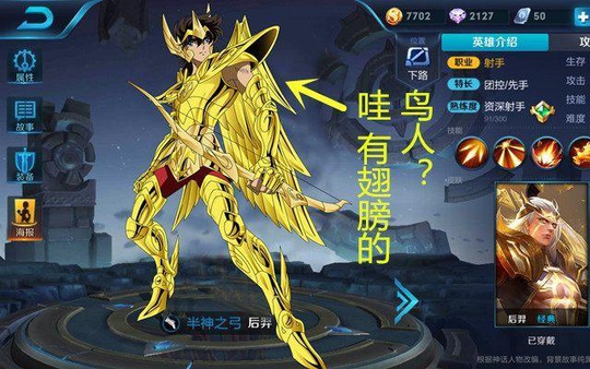 那如果是后羿的话,这款皮肤就有意思了,小伙伴们都知道,圣斗士里的射手座艾俄洛斯背后是有翅膀的,难道王者荣耀里的后羿新皮肤也会有翅膀吗?想想就很期待啊!