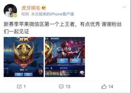 由于国服王者的计算机制,啊毛不仅是第一位冲上S11新赛季的最强王者,应该还是第一位荣耀王者。而啊毛刚上第一也跟粉丝们分享了这个消息,不过那些正在冲刺的虎牙主播还有多久把前十霸占呢?让我们一起拭目以待吧~