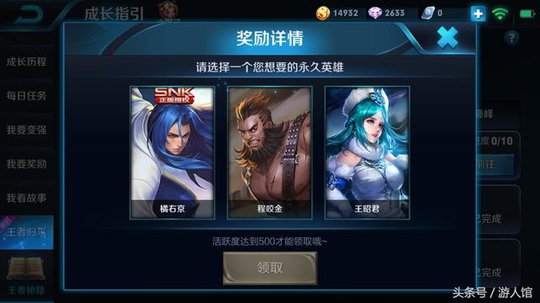 要怎么获得这个英雄呢?当回归活跃度满的时候就可以得到了,这也就是说大家只要把每天的任务完成就行了。大家可以也登自己的小号看一看。看是不是得到了SNK英雄的福利吧,如果大号没有这些英雄的话,有时候就可以在小号来玩一玩了。