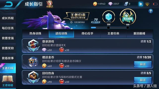 首先,这个活动是在成长指引里面的,大家可以看到多了一个王者归来。而这个王者归来一共分为五步,第一步是热身训练,这个是比较简单的,什么登录游戏啊。赠送金币呀,回归热身啊,相信大家要完成都是很轻松的事。