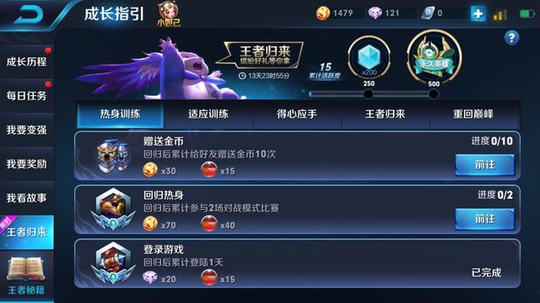 你说这东西你也好意思送给我,我真的觉得我都不好意思接受了。真的想吐槽天美策划真的坑,一点好处不给,不过我翻了半天在日常任务里面发现自己还有回归任务去做,具体的就是要连续登录游戏,每天参与对战或者邀请好友来玩游戏就可以获得一定的活跃度,然后通过自己的活跃度来领去钻石金币等等。