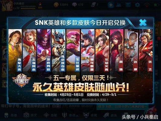 还记得去年的五一节活动么?是上面这一张图,有SNK英雄的返场和多款皮肤英雄自由兑换,其中就包含了去年热门英雄周瑜、张飞和达摩。