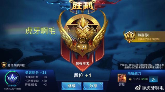而虎牙阿毛在新赛季的上分里面,一局都没有输过,直接以19连胜成功冲上了王者.虎牙啊毛虽然被称为是国服第一马可波罗,但是在使用其他英雄时,实力依然非常顶尖,在最后一把关键局中还拿出了苏烈这个英雄.