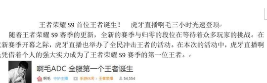 并且在之前的S9赛季时,虎牙阿毛也是在新赛季成为王者的第一人,可见这个主播在王者荣耀这个游戏里面的实力.