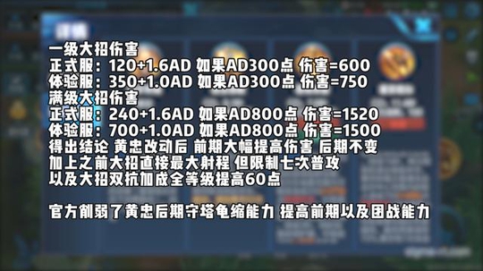 第一个是关于黄忠,可能大家眼中黄忠还是那个守塔非常强,后期很给力的膀胱型英雄。现在体验服黄忠节奏变快已经很久,而这次改动将黄忠的节奏变的更快,跟猴子在体验服的改动有点像,把普攻的加成从160%变成100%,但是基础伤害提高了很多。
