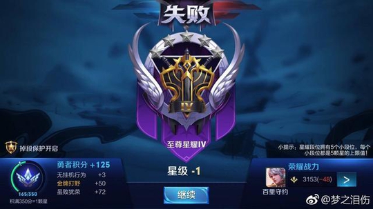 梦泪昨日就发布了微博像自己的粉丝倾诉,微博图中带有他排位失败的图,仔细一看梦泪光勇者积分就加了125分,输了还能家这么多真是虽败犹荣,同时看到梦泪的段位已经冲到了星耀4,在这么短时间能冲到这种段位的玩家至少是前赛季王者好几十星的大神,在这个群雄争霸的分段还能获得这么多积分真是让人感叹,队友也不知道是不是故意输的。