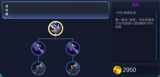 如图,合成价值2950金币的破军需要的小件是两个风暴巨剑,而且还差1000多金币。