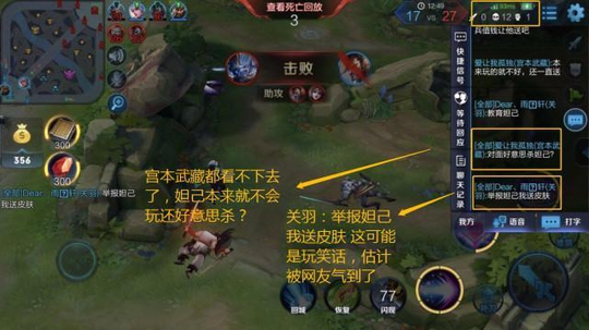 队友看到妲己这样也是心疼了一波,看来还是网友演得太好了,宫本武藏之前还非常气愤,现在转脸就说了敌方玩家,还好意思杀妲己?但另一个队友就不一样了,关羽已经在喊举报妲己送皮肤了,网友看到这条信息的时候也是想举报自己一波,想想还是专心的送人头了,对不住这个关羽了!哈哈~