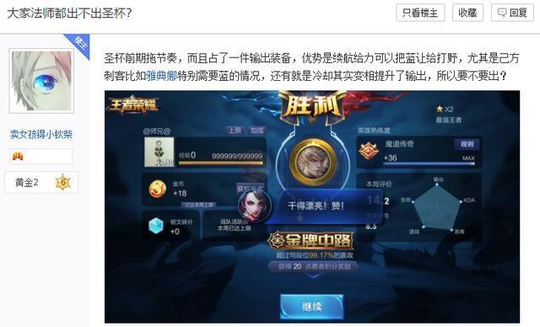 玩家表示嬴政一直都是痛苦面具、回响之杖、大帽子、冰霜法杖、忍者足具、圣杯,这样出装的嬴政线上消耗强,回蓝块,伤害高,最重要冷却时间短,而且玩家也分析了一波出圣杯的好处.可以让蓝给类似雅典娜这种比较耗蓝的打野.