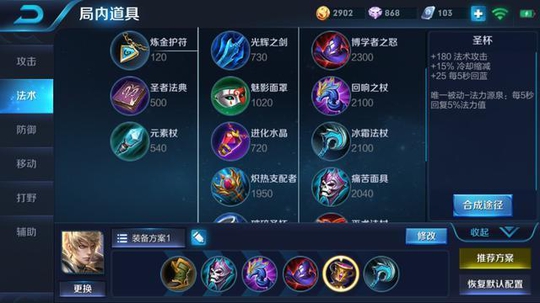 玩家表示这个小技巧精髓在于英雄的出装,只要把这件装备合出来了,那前中后期基本都不用回家了,这个装备就是圣杯,估计这个装备很少玩家会出,特别是在低端局,玩家都一位叠输出,叠穿透,根本没想过去这种有冷却和回蓝效果的装备,其实圣杯这个装备一旦出了,对于中路英雄来说是非常好的,特别是那些很耗蓝的英雄.比如嬴政是最适合出圣杯的.