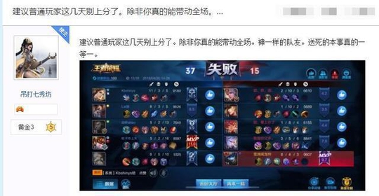 总结以上玩家的经验,百事达觉得没有相当高技术的玩家真的不要玩排位赛最近,毕竟现在都是一些大神主播,代练,职业选手冲段位的时间,他们都会组团开黑的,所以让玩家产生了一种对面永远大神级别,队友都是小学级别的错觉,不知道最近其他玩家的战绩怎样呢?跟上目的玩家一样吗?小编最近也是7连跪.