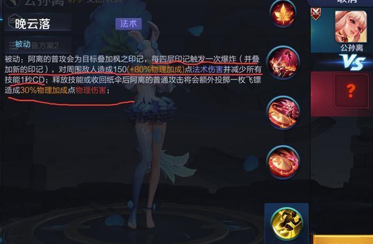 公孙离的印记也是需要4次才能触发,触发后会低敌人造成法术加物理的伤害,而且还能减速所以技能1秒的cd,公孙离的这个印记在实战中还是非常好用的,在配合灵活的位移技能收割起来非常快。