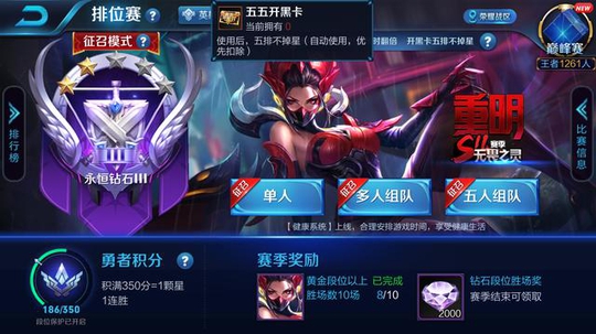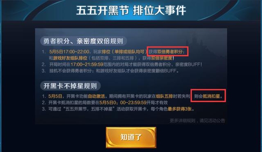 排位大事件:5月5日当天,拥有开黑卡的玩家,在排位五黑的时候,失败之后不掉星!而且下午五点至晚上十点,排位可获得双倍勇者积分,开黑排位还有双倍亲密度!