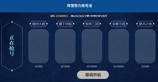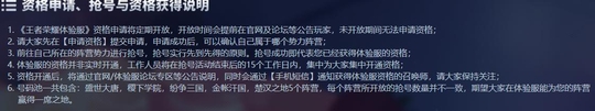 申请成功后,在下午三点的时候还要记得回来进行抢号。目前有体验服有五个势力,名额各不相同,小伙伴们可以根据自己的喜好来选择。另外,尽量使用电脑端进行抢号,并且准备多个浏览器防止出现不兼容问题。