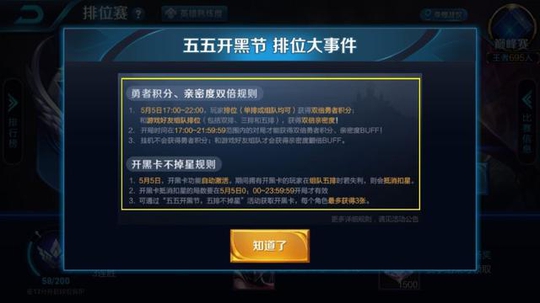 五五开黑节排位大事件!五排免掉星,勇者积分亲密度双倍加成
