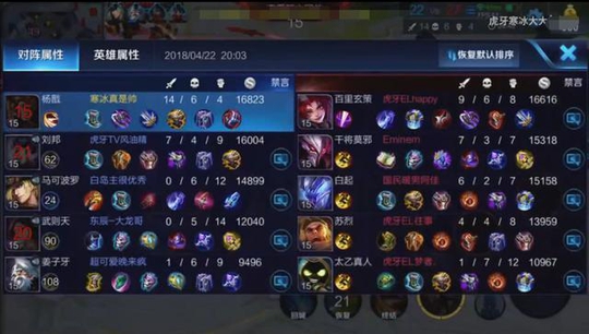 寒冰的杨戬果然非常强,寒冰的杨戬在人群中做到狗咬无限连,寒冰在团战中打出超高的伤害,寒冰在这一把中已经发挥的非常出色,寒冰的在这一局中击杀了14人,不过寒冰这边的阵容太脆了,而且也没有切干将莫邪很好的点,所以最后寒冰虎牙公会战第一场战败.