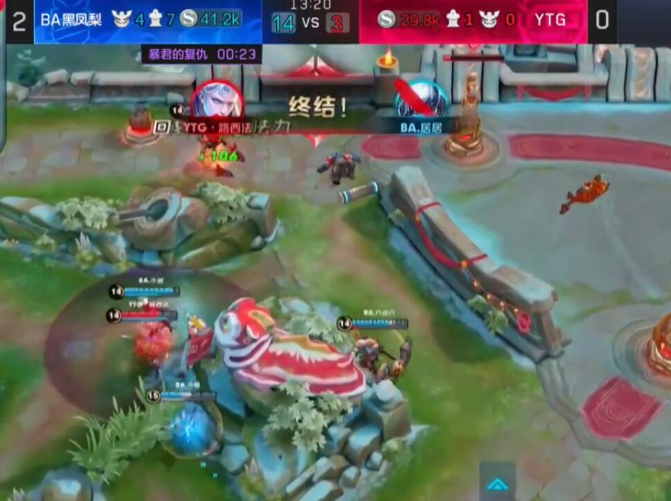 第二局也是前期野区的一场团战就奠定了整场比赛的形势,YTG的裴擒虎过于深入,直接被秒。最大的输出没了之后,BA黑凤梨连续拿下四个人头。之后就把这个优势成功的滚起来雪球。双方经济差非常之大。最后一波就算太乙真人被老夫子绑住也没什么用,BA黑凤梨直接点破了水晶。