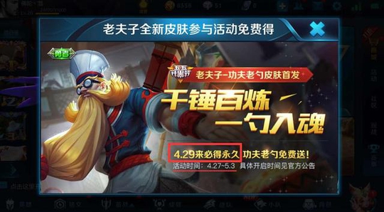 而现在,只要参加活动将会免费获得一个老夫子的新皮肤,就问你心动不心动。但是要注意一点,从宣传海报可以看到,只有在4月29号参加活动才是永久的,其他时间段估计都是限时皮肤,所以小伙伴们一定要注意参加活动的时间。