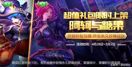 八、阿轲致命风华和黑猫爱糖果礼包4月28号至5月2号限时上架,此次两款皮肤返场是以抽取的方式,奖励还包含了英雄碎片和荣耀积分等!