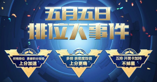 还有五排不掉星的活动。在4月29号到5月5号通过游戏内的五五开黑节活动,可以领取开黑卡,每个角色最多有三张。而这个开黑卡可以在5月5日使用,在五排失败的时候就抵消扣星,大家可以安安心心的上一波分了。同时在5月5日的17点到22点,勇者积分和亲密度也都是翻倍的,官方就是想让大家在那天来好好的开几把黑。