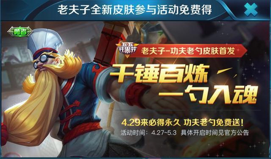明天只是开启了五五开活动的序幕,在4.29日登录还可以免费领到一款新皮肤就是老夫子的功夫老勺