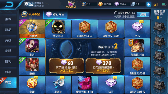 商城夺宝是一个很“吃”运气的栏目。积分商城的稀有水晶-荣耀水晶,是众王者迷梦寐以求的存在(因为它能够开出超级法师-武则天和很多稀有皮肤)。我身边的朋友好多都是充值500+才抽中这家伙的。这个难度可见一斑!然后钻石夺宝也相当“吃”运气,很多撸友都是抱着花60钻石抽中韩信的希望点进去的。往往希望越大失望越大,不知道花了多少钻石,点了多少次按键。只看见幸运石逐渐被填满,由黑色的空瓶变成了充盈的蓝水晶,突然哐当一下“恭喜你,中奖了”!此时的心情不是激动,而是心有不甘的一种占有欲罢了,已经找不到梦想开始的那种心潮澎湃的感觉了。
