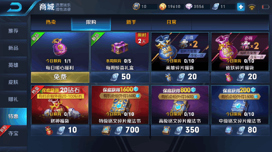 这个活动在商城特惠栏里,特惠-限购首页第一件商品就是它了。这是天美给广大网友免费发放的福利。名字很贴心(每日暖心福利),正常情况下点开之后你能够获得10钻石。但是它还有一个隐藏大招,如果运气足够好的话,你是能够获得666钻石的。这个活动每天仅限一次,玩了这么久我就中过两次666,后面钻石太多了也就失去了第一次中大奖的那种激动感觉了,现在我都懒得去点这个活动了!
