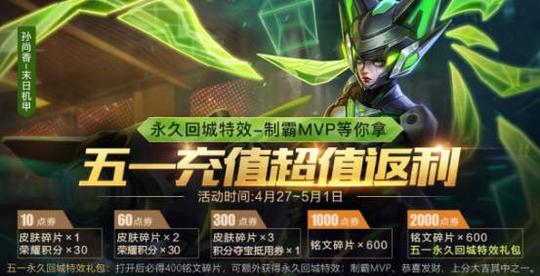 又是一波屯荣耀积分的活动,不过这次召唤师一次充值满2000点券即可返利五一永久回城特效——制霸MVP、恭喜发财、上分大吉中的一个!